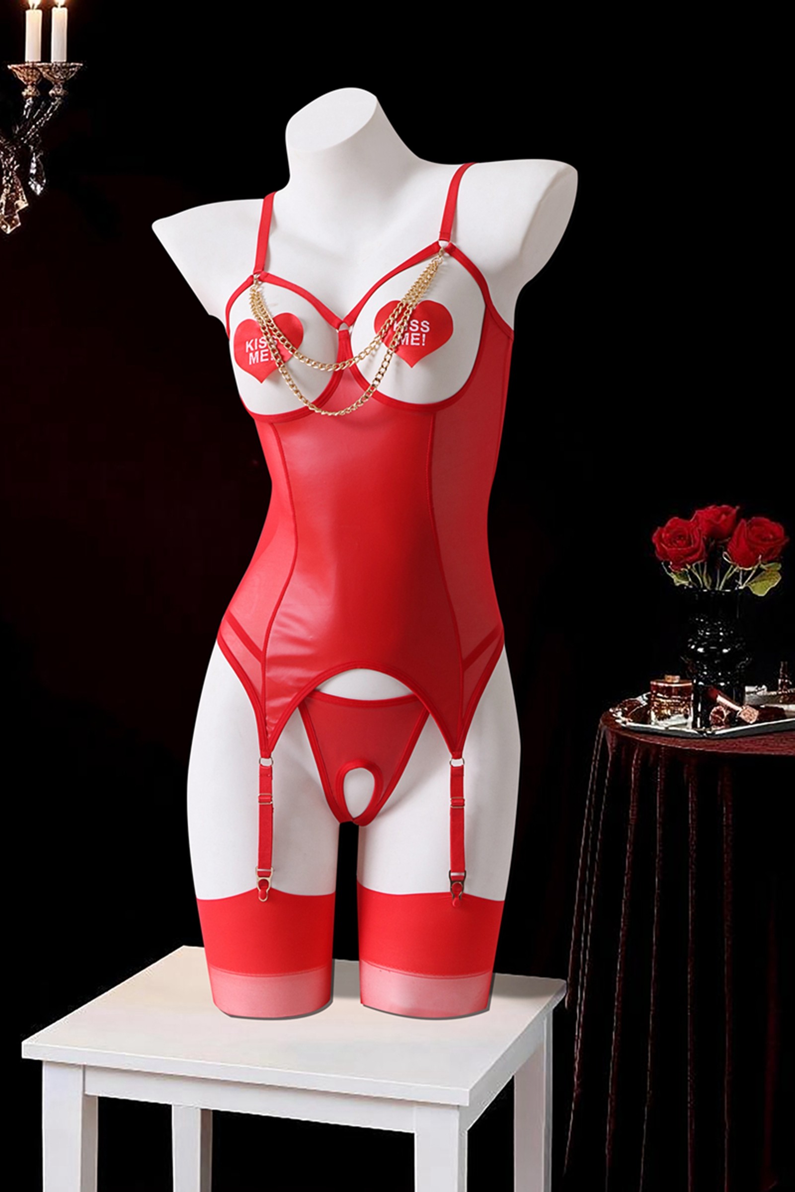 W zestawie znajdują się także stringi typu ouvert oraz pończochy, które dopełniają zmysłowego efektu.